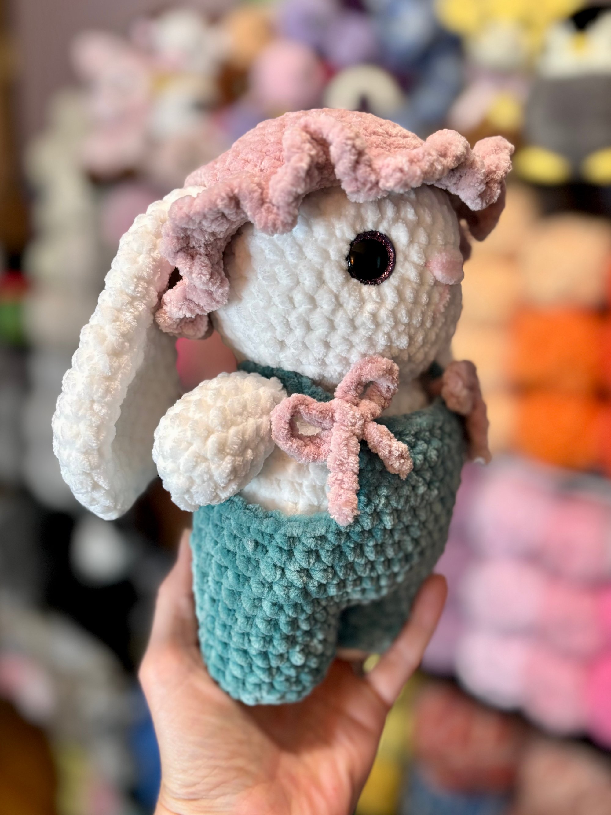 Meet this sweet crocheted white bunny, dressed to charm in a pink ruffle hat and soft green overalls! Handmade with love and attention to detail, this cuddly bunny features floppy ears, pink sparkly eyes, and a gentle smile. Her playful pink ruffle hat adds a touch of whimsy, while the green overalls give her a vintage, storybook feel. Whether you’re looking for a unique gift, a cute shelf companion, or a cheerful addition to your handmade collection, this little bunny is sure to bring a smile to your face.