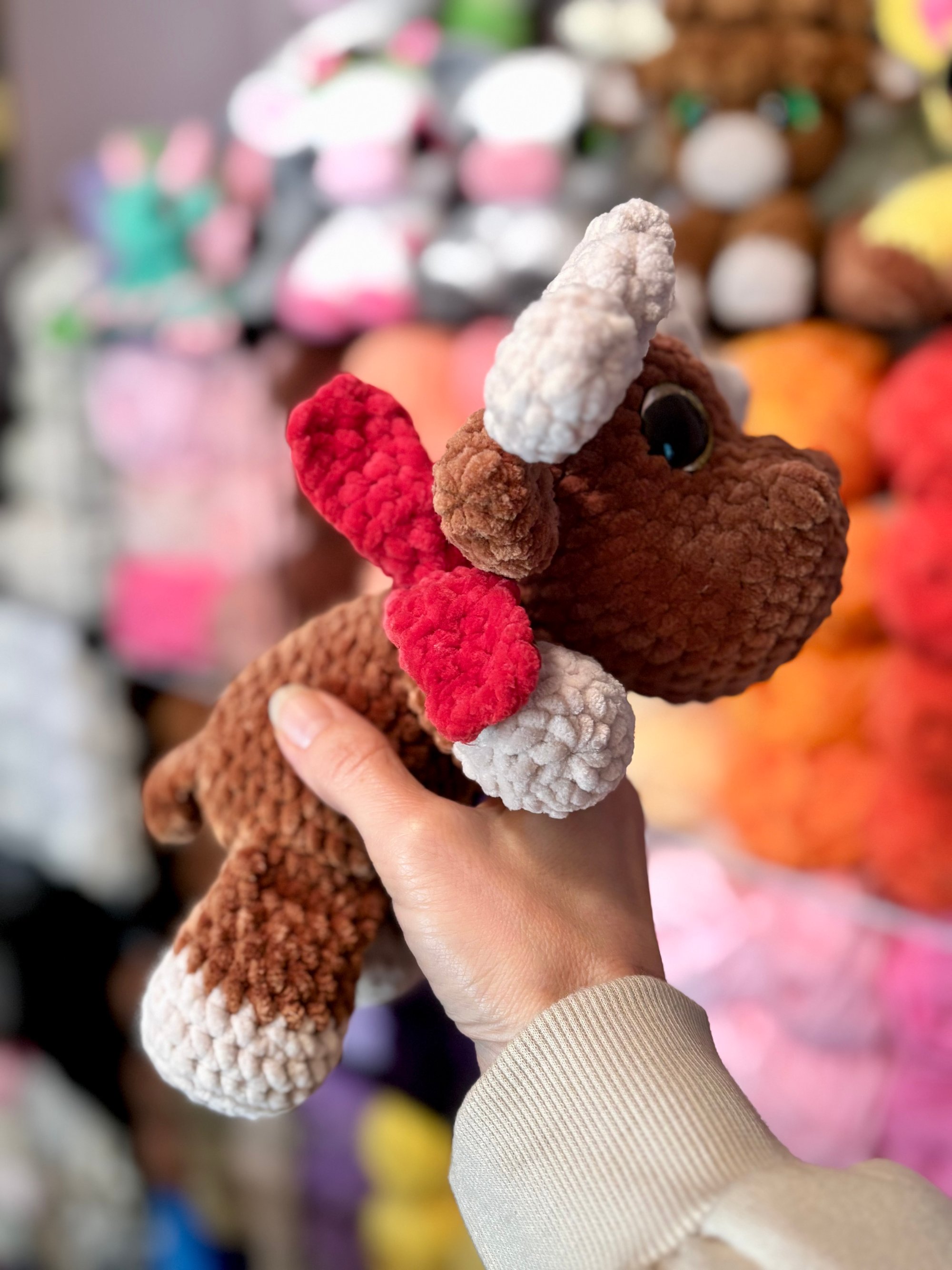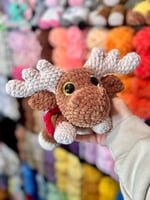 Meet this charming crocheted moose, handmade with love and full of woodland whimsy! Crafted from soft, durable yarn in warm brown tones, this cuddly moose features big floppy antlers and sweet big yellow eyes. He’s bundled up for winter in a bright red scarf, adding a festive pop of color and personality. Perfect as a holiday decoration, a cozy companion, or a thoughtful handmade gift, this moose is ready to bring rustic charm and snuggly vibes wherever he goes.