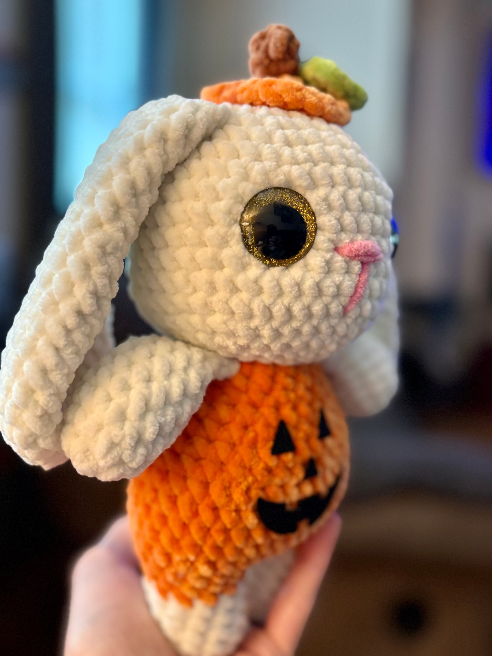 This little bunny is ready for spooky season! Handmade with soft white yarn, this adorable bunny features a round pumpkin-shaped body with a sweet little pumpkin hat with a stem on top of her head! Her bright eyes and tiny details give her extra charm, making her the perfect mix of cozy and festive. A cute companion for Halloween or a whimsical touch of autumn all year round!