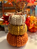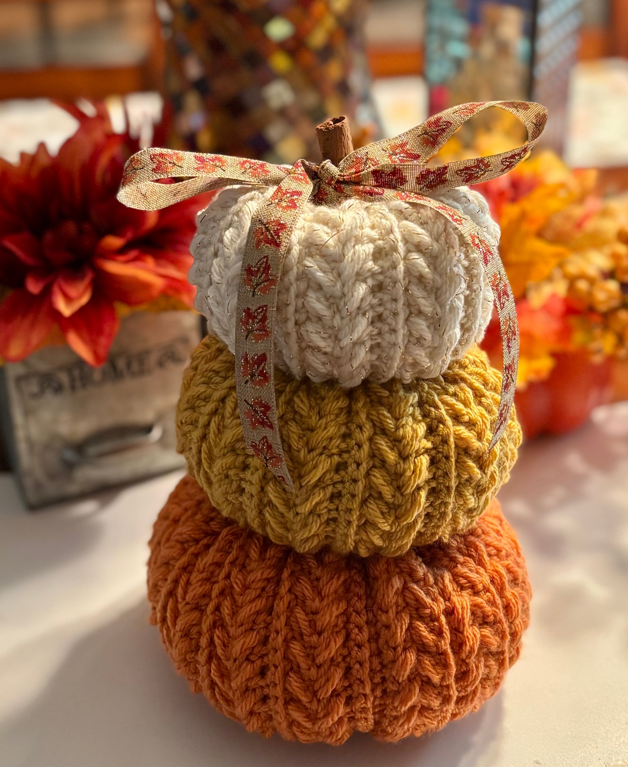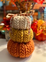 Bring the warmth of fall into your home with this crocheted wheat stitch pumpkin spice trio. Each pumpkin is carefully crafted with the textured wheat stitch, giving them a rustic, harvest-inspired charm. Topped with an autumn-themed bow and a real cinnamon stick stem, this trio looks as cozy as it smells. Perfect for your seasonal décor, tiered trays, or a thoughtful handmade gift, these pumpkins capture the heart of autumn in every detail.